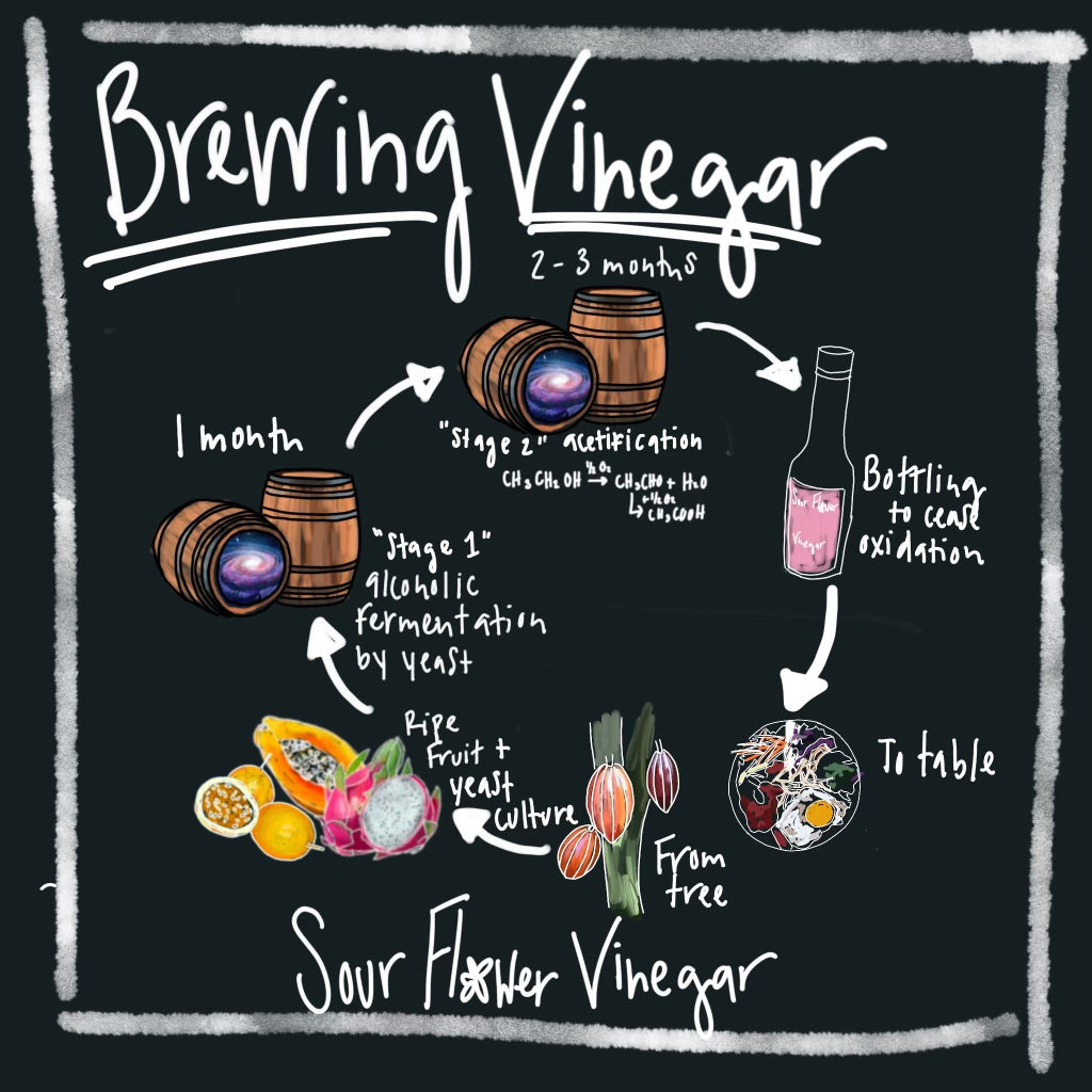 Each batch of vinegar is a singular creation, a fleeting moment eternalized through fermentation. Once the fruit has become vinegar, it will never go bad.